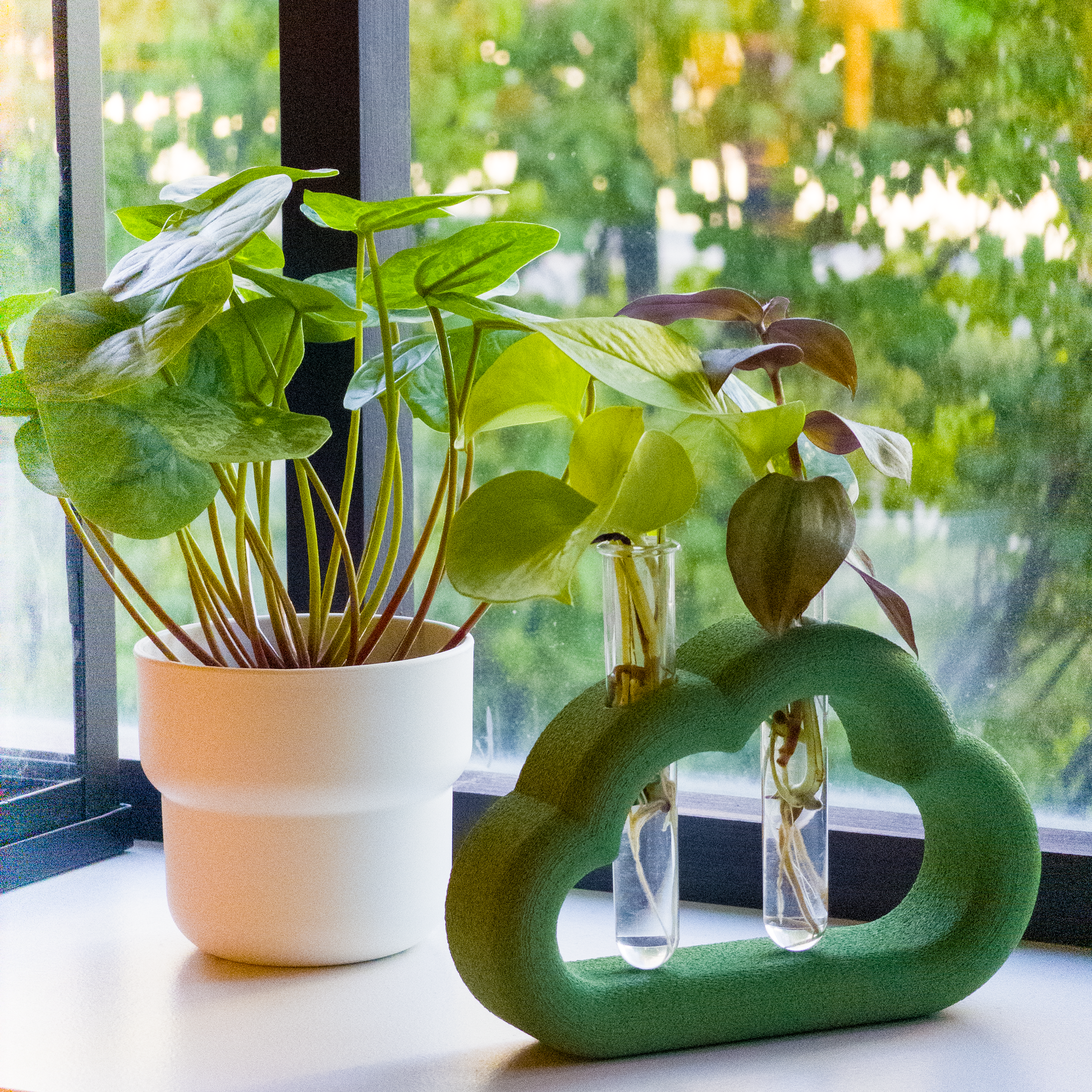 Bring calm and lightness into your space with the Cloud Series vase. Crafted from 100% plant-based, eco-friendly materials, it features two glass tubes for effortless, soil-free plant care—perfect for hydroplants and cuttings. Its soft, organic shape and neutral tones create a soothing, modern look.